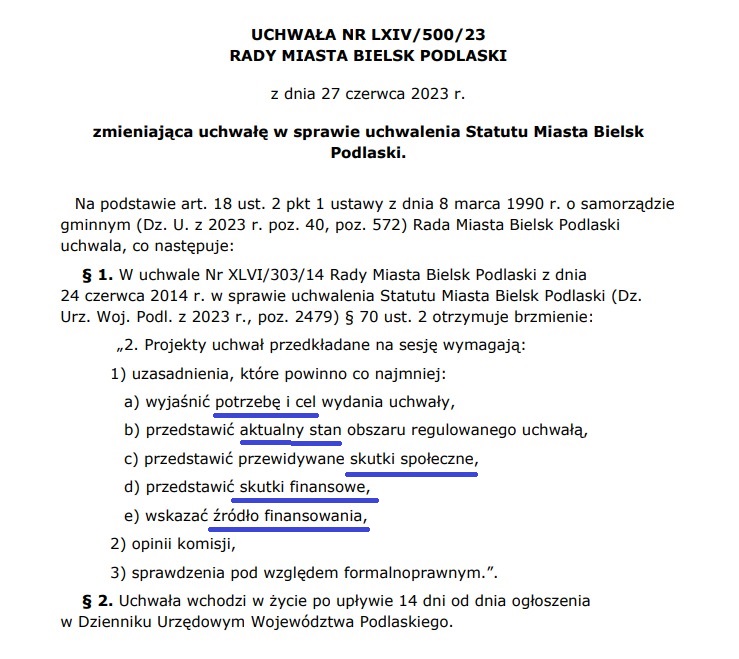 Przeglądając projekty uchwał przygotowane na LXV sesję Rady Miasta Bielsk Podlaski zauważyłem, że każda zawiera uzasadnienie spełniające wymogi.