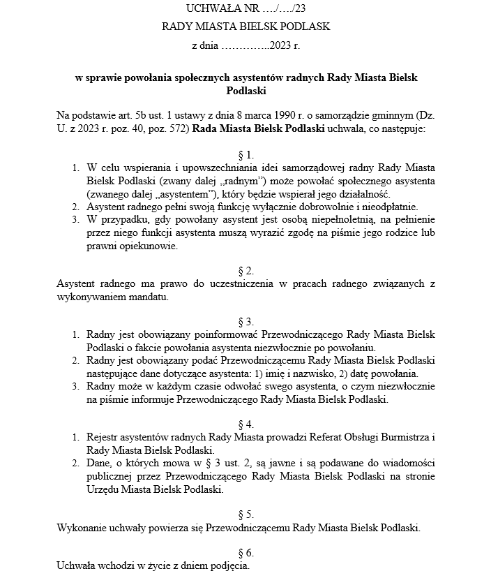Uzasadnienie przywołuje podstawę prawną, która może sankcjonować ustanowienie asystenta radnego. Wyjaśnia również cel i skutki społeczne takiej inicjatywy.