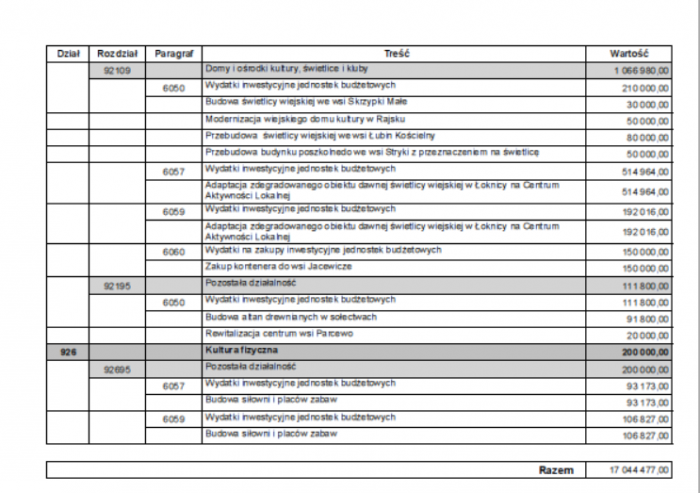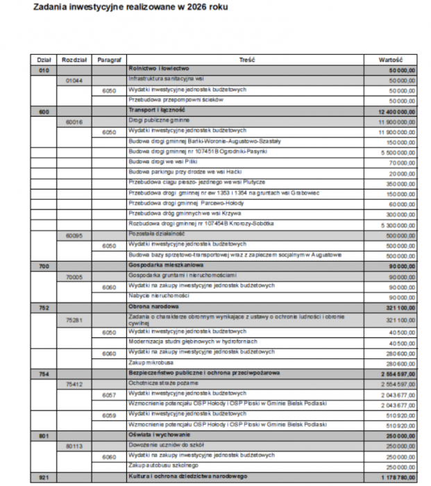 W dniu dzisiejszym znalazłem projekt budżetu gminy, który zawiera zadania inwestycyjne planowane do realizacji w 2026 r. Niestety nie znajduje się on w zakładce BIP do tego przeznaczonej, a jedynie w zarządzeniach wójta z listopada.