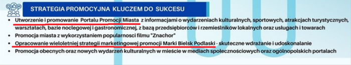Obserwując działania burmistrza wyraźnie widać nastawienie na promocję. Nie dostrzegam jednak w tym jakiejkolwiek strategi, czy też przemyślanych celów, które samorząd zamierza osiągnąć. Cała aktywność burmistrza jak i jego ekipy skupia się na wywołaniu jak największego szumu wokół swojej działalności, wokół siebie i swego obozu. Musi być głośno o działaniach burmistrza tj. często, dużo i wszędzie.