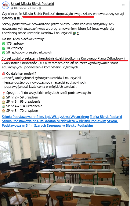 Jednakże zaczynanie od przypisania sobie sukcesu pisząc, że Miasto Bielsk Podlaski doposażyło swoje szkoły, a dopiero dalej wzmiankowanie, że ze środków KPO, to jest nadużycie, bo rola UM była tu bardzo drugoplanowa.