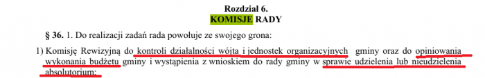 Kolejna absurdalna sprawa. Po co komisja rewizyjna rozpatruje wspólnie z pozostałymi komisjami projekty uchwał. Jej zadaniem nie jest robienie tego samego co komisja oświaty, czy budżetu. Ona powołana jest do konkretnych spraw, o których mowa w między innymi statucie (poniżej).